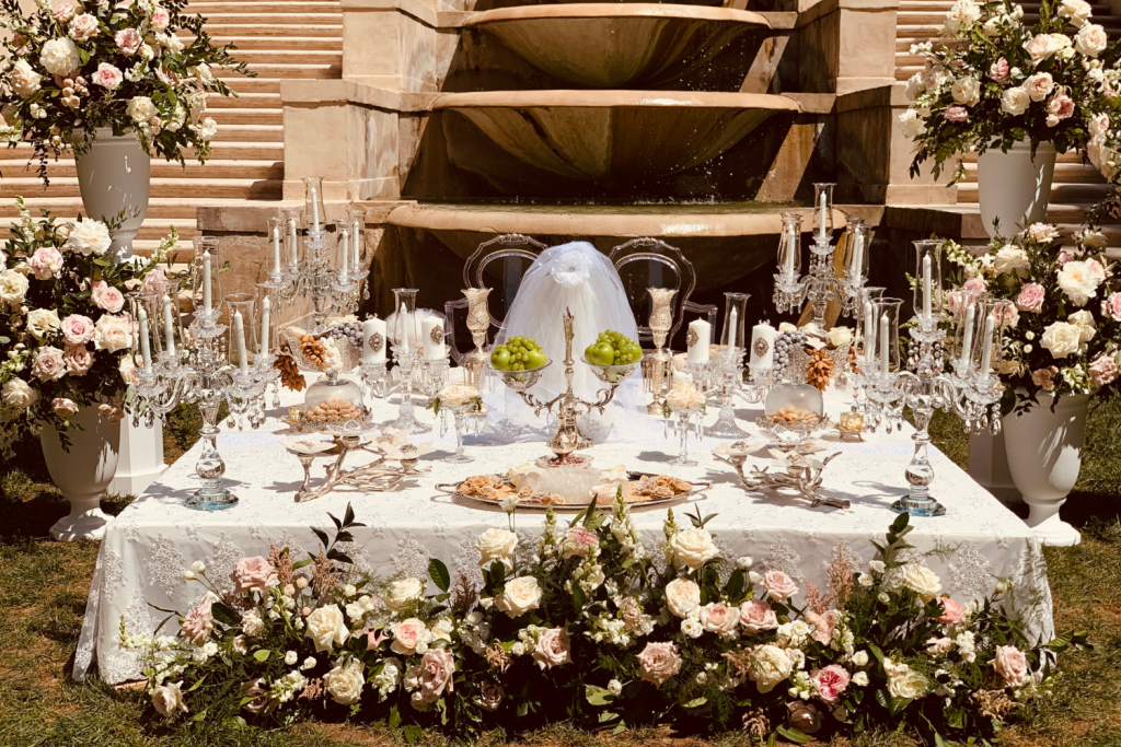 From romantic and elegant to modern or vintage styles, each Sofreh is thoughtfully curated to reflect the couple’s unique story while honoring generations of Persian heritage. During the ceremony, symbolic rituals unfold before the beautifully arranged Sofreh — from showering the couple with sweetness during the sugar-grinding ritual (Kalleh Ghand) to the symbolic honey exchange, each moment representing joy, unity, and the sweetness of married life.