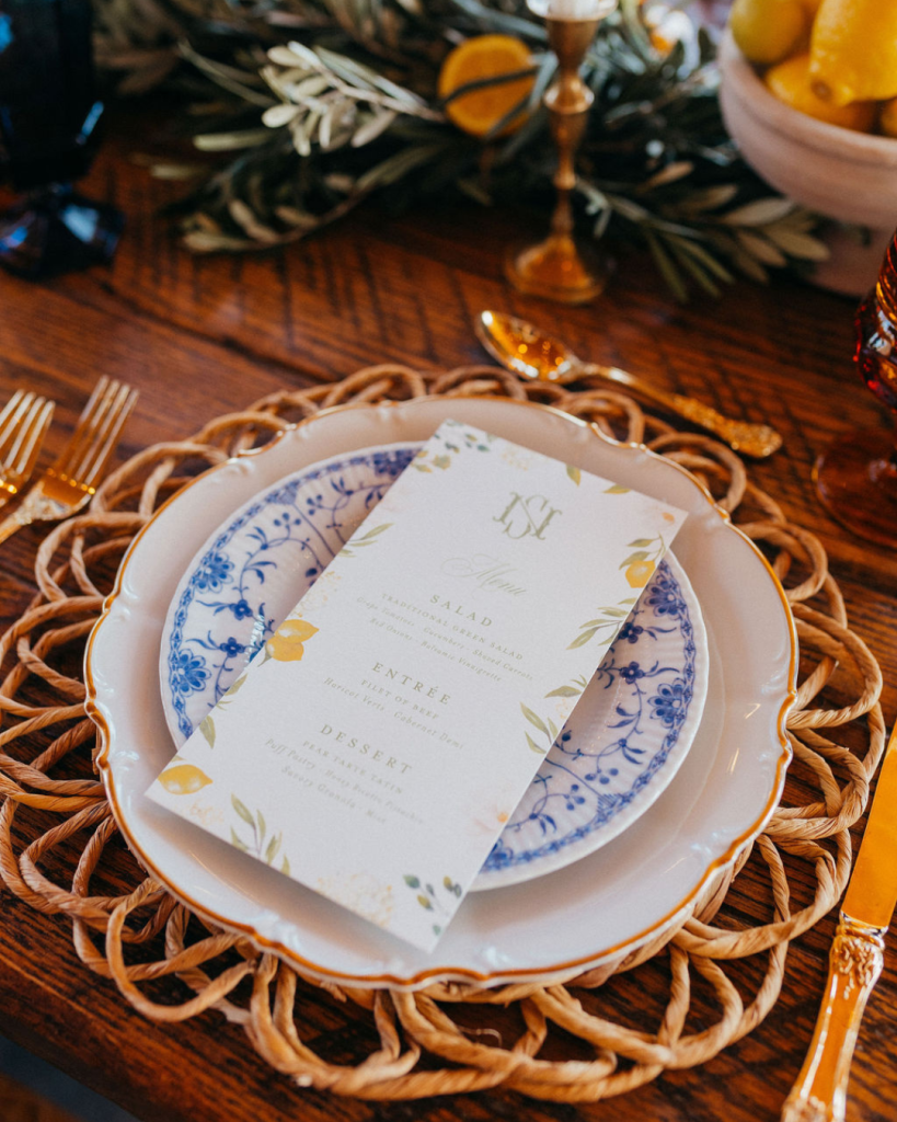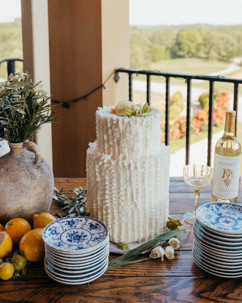 No Tuscan-inspired celebration would be complete without thoughtful culinary elements. A textured white cake by Oh Sweet Bakery stood tall among stacked patterned plates and fresh lemons, while traditional Italian-inspired desserts were displayed on blue-and-white china for an authentic touch.