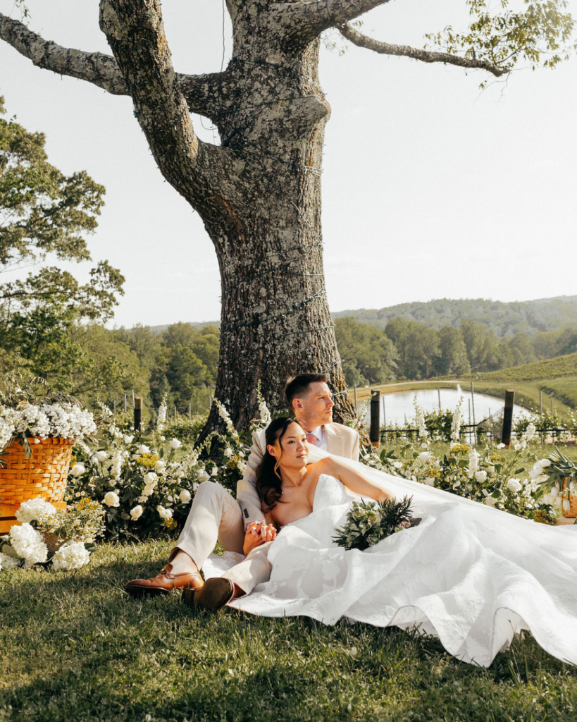 The backdrop? Endless rows of vines, soft green hills, and that unmistakable late-afternoon glow that photographers dream about. The couples were styled to feel organic within the landscape—lounging beneath a grand tree, walking hand-in-hand through the vineyard, and embracing in that cinematic golden light that makes everything feel just a little more magical.