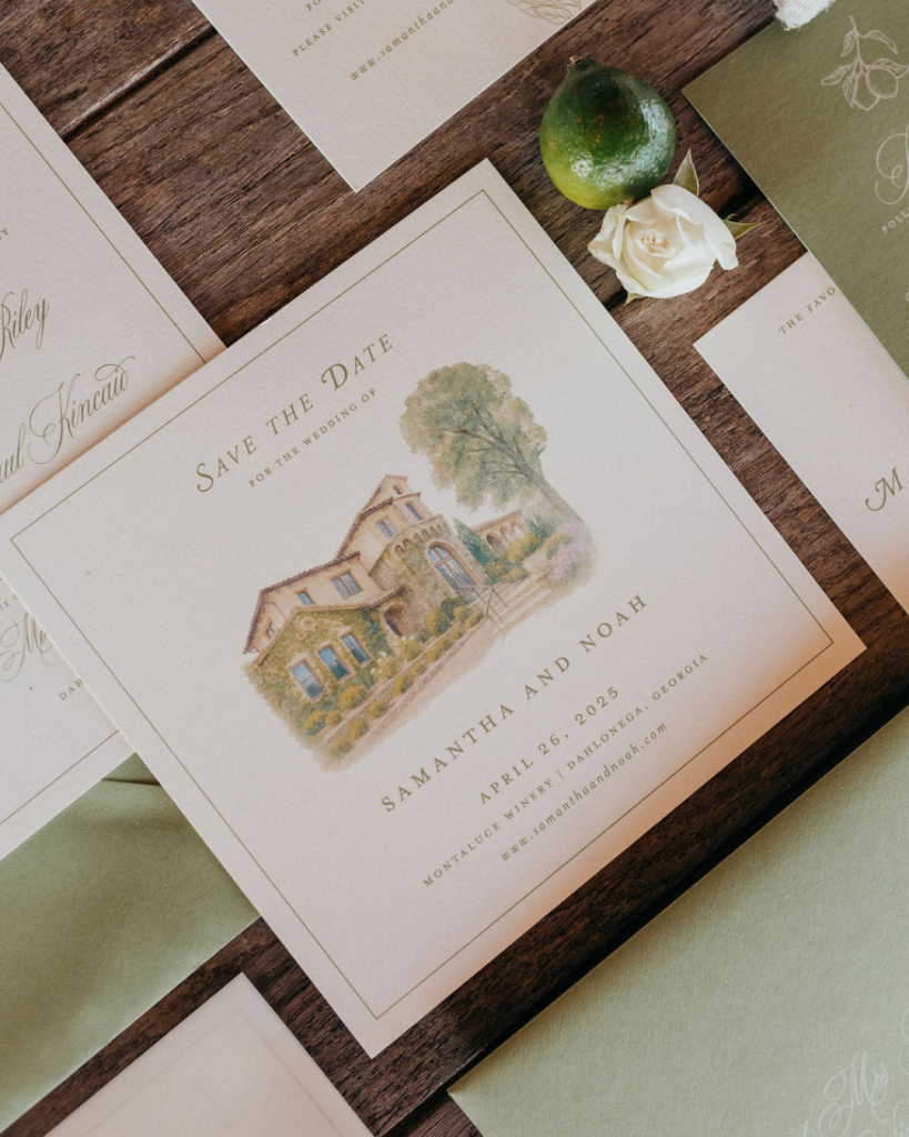The tablescape felt intimate and inviting—like a long, lingering dinner under the Tuscan sun. Olive branches and fresh citrus added a Mediterranean touch, while delicate floral details softened the overall look. The stationery suite, featuring a romantic villa illustration, tied everything together with an unmistakably European flair.